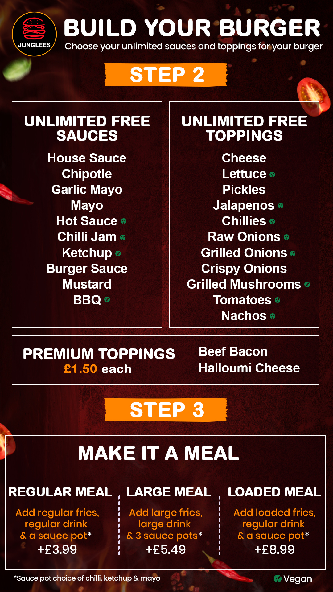 We totally get it – you want to decide what toppings and sauces go in your burger. It’s your flavours – your choice. That’s why at JUNGLEES we let you build your burger. Choose from a range of our free premium toppings and sauces. The great part is its all unlimited!